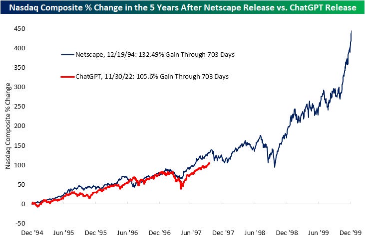 If history does not repeat itself, it can at least rhyme. One good example of this has been the performance of the Tech-heavy Nasdaq since the AI era began in earnest with the release of ChatGPT in November 2022. In our chart below that we first published in early 2024, we show the move in the Nasdaq Composite since ChatGPT's release and compare that to the move in the index following the release of the first modern web browser, NetScape, in December 1994.