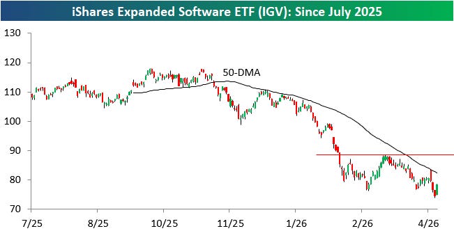 From Tuesday’s close (the night the US/Iran ceasefire was announced) through Friday, the iShares Expanded Software ETF (IGV) fell another 8% and made fresh 52-week lows in the process.